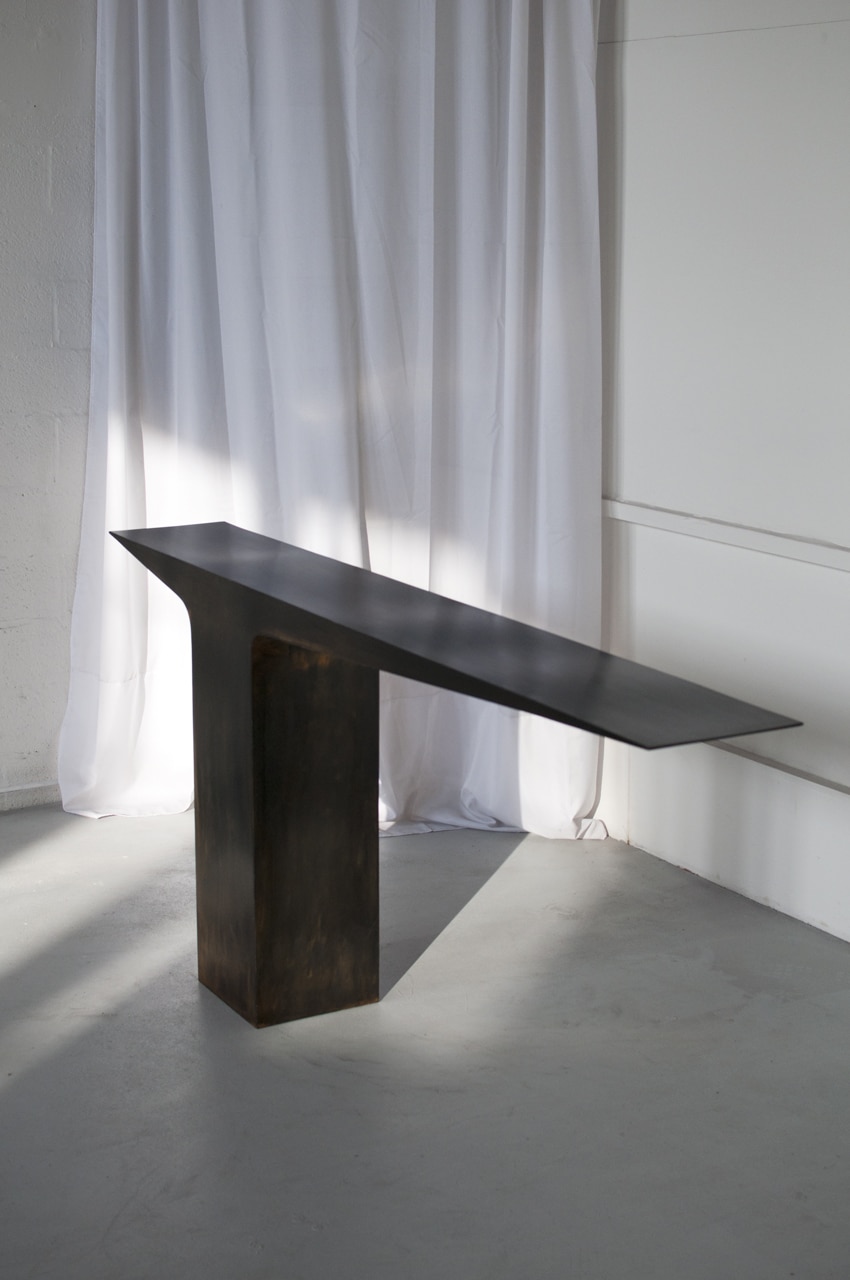 L’édition limitée à 8 + 4 épreuves d’artiste  de la console Blade en acier inoxydable a été entièrement produite. La nouvelle direction artistique se tourne vers l’acier brut patiné avec une patine à l’acide finie avec une huile de Jade. Le résultat est très foncé avec des reflets de couleurs et de profondeurs changeantes.