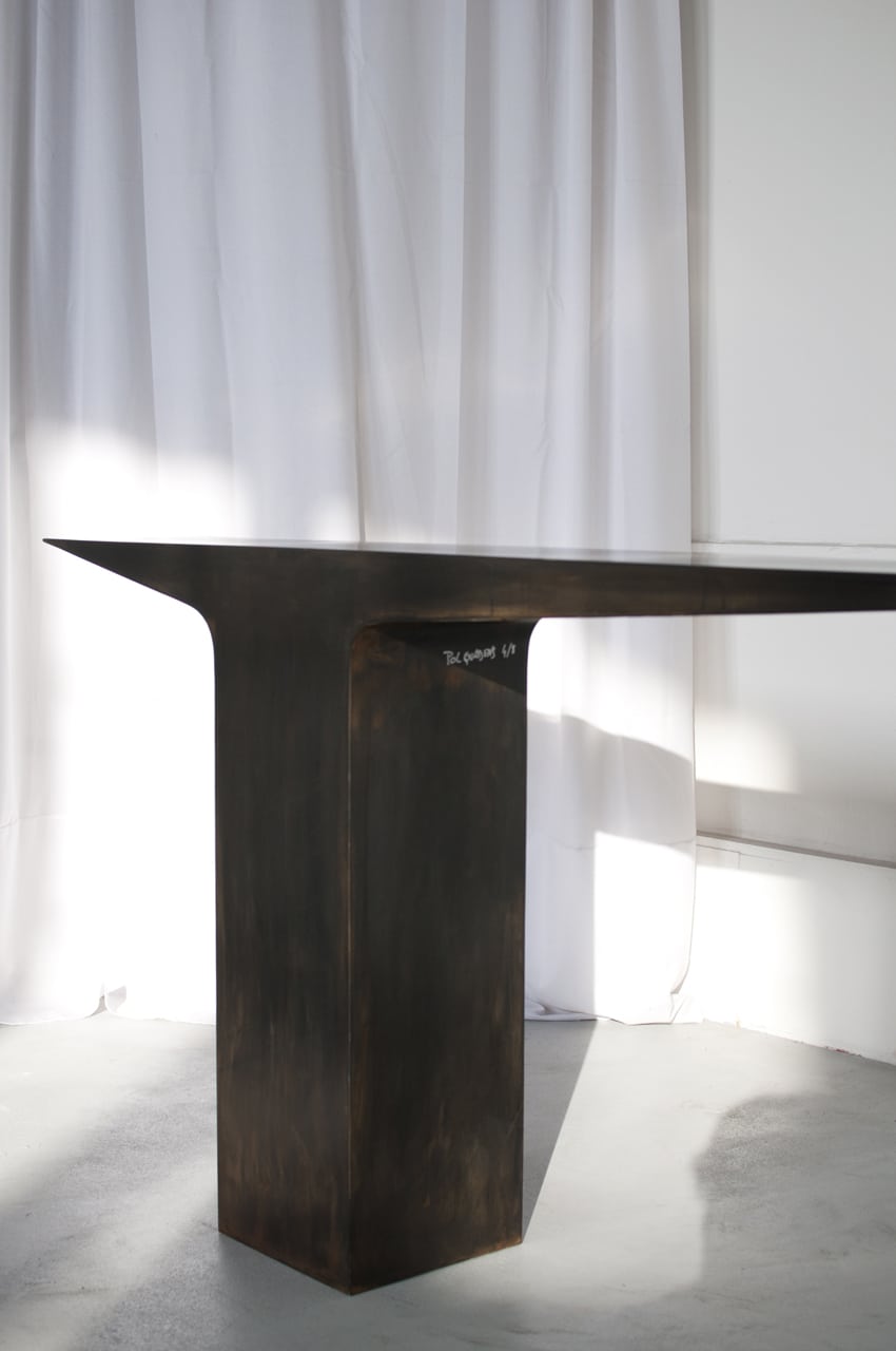 The limited edition 8 + 4 artist proof of the Blade console in stainless steel has been completely produced. The new artistic direction turns to raw steel weathered with an acid patina finished with a Jade oil. The result is very dark with reflections of changing colors and depths.